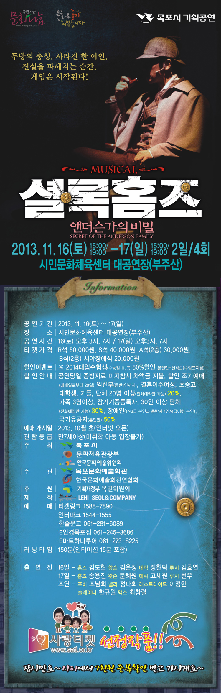 공연전시축제 셜록홈즈 뮤지컬 앤더슨가의 비밀 장소 시민문화체육센터 대공연장(부주산) 일정 2013.11.16(토)~17(일) 목록으로 셜록홈즈 뮤지컬 앤더슨가의 비밀 2013.11.16(토)~17(일) 2일/4회 시민문화체육센터 대공연장(부주산)