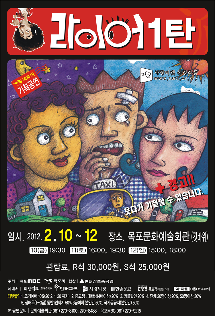 공연전시축제 라이어1탄 장소 목포문화예술회관(갓바위) 일정 2012. 02.10 ~ 12 목록으로 일시: 2012.02.10~12 장소: 목포문화예술회관(갓바위) 10(금)19:30 / 11(토)16:00,19:30 / 12(일)15:00,18:00 관람료: R석 30,000원, S석 25,000원 주최:목포MBC, 목포시 협찬:현대삼호중공업 예매처: 티켓링크 인터파크 사랑티켓 한솔문고 E안경(차없는거리) 이마트(하나투어)