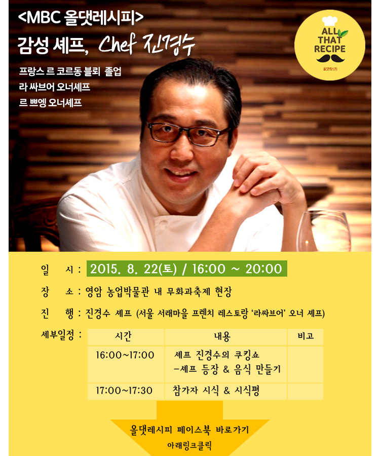 공연전시축제 올댓레시피-셰프 진경수의 푸드쇼 장소 진경수 셰프/영암 농업박물관 내 무화과축제 현장 일정 2015. 08. 22(토) 16:00 ~ 목록으로 ‘올댓레시피-셰프 진경수의 푸드쇼’ 일 시 : 2015. 8. 22(토) / 16:00 ~ 20:00 장 소 : 영암 농업박물관 내 무화과축제 현장 진 행 : 진경수 셰프(서울 서래마을 프렌치 레스토랑 ‘라싸브어’ 오너 셰프) 세부 일정 16:00~17:00 셰프 진경수의 쿠킹쇼 (셰프 등장 & 음식 만들기) 17:00~17:30 참가자 시식 & 시식평