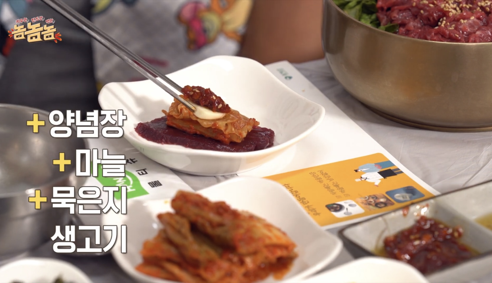 생고기에 +묵은지 +마늘 +양념장을 올리면
