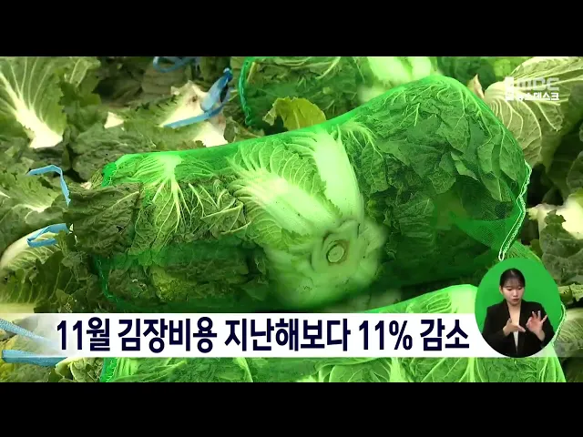 11월 김장비용이 지난 주에 이어지난해보다 낮은 수준을 유지하는 것으로 나타났습니다. 한국농수산식품유통공사는 지난 20일 조사 결과,배추 20포기의 김장비용은 19만 1천 원으로,지난해 같은 기간보다 11% 낮다고 밝혔습니다. 정부가 김장재료 공급을 늘리고대형유통 업체가 할인 행사을 열어주요 재료의 가격이 떨어진 ...