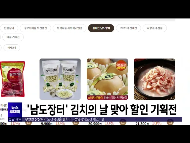전남 온라인 쇼핑몰 ‘남도장터’가 지역 농특산물의 수급 안정을 위해 '20% 할인 김장' 기획전과 '수산물 사랑해' 기획전을 운영합니다.11월 22일 김치의 날을 맞아 열리는이번 기획전에서는 김장에 필요한 젓갈류 등 수산물은 최대 30%, 배추, 고기 등 농축산물은 최대 20% 할인 판매됩니다.행사는 남도장터 쇼핑몰에서 진...