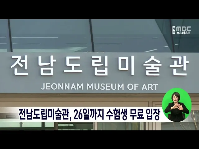 전남도립미술관이오는 26일까지 수능 수험생들에게무료입장 혜택을 제공합니다. 현재 도립미술관에서는금속과 미러볼 등 다양한 재료와 기법을선보이는 황영성 초대전 '우주가족 이야기'등이열리고 있으며, 본인 명의의 수험표를 지참하면무료로 관람할 수 있습니다.