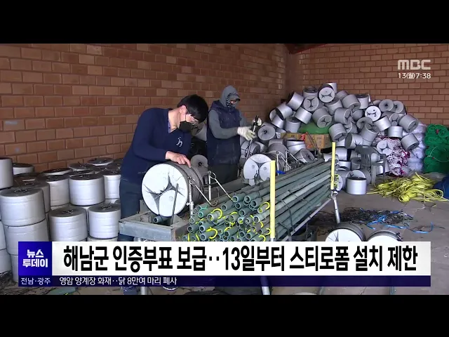 해남군은 오늘부터 모든 어장에서 스티로폼 부표의 신규 설치를 금지하고, 인증부표 보급 지원에 나섭니다. 해남군은 인증 부표 설치사업에 지난해 110억원을 투입한데 이어 올해는 124억원을 배정하고, 내년도 100% 어장 보급을 목표로 인증부표 설치를 지원하고 있습니다. 기존 스티로폼 부표는 쉽게 부스러져 미세플라...