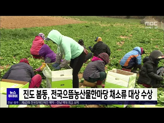 진도봄동이 ‘제32회 전국으뜸농산물한마당대회’에서 농림축산식품부장관상인 대상을 수상했습니다. 이번 행사에는 전국 17개 시‧도 농업경영인연합회가 출품한 농산물을 곡류와 과일, 채소, 특작, 화훼 특별품목 등으로 나눠 시상한 것으로, 진도봄동은 바닷바람을 맞고 자라 단맛과 식감이 좋은 것으로 평가됐습니다.