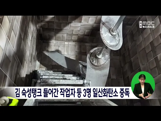 오늘 오후 2시 40분쯤해남군 화산면의 한 김 가공공장 숙성탱크안에 들어갔던 50대 작업자 등 3명이 의식을 잃고 쓰러졌다 119에 의해 병원으로이송됐습니다.소방당국에 따르면2.5m 깊이 숙성탱크에서 청소 중이던근로자 1명이 일산화탄소 중독으로 의식을잃었고 나머지 근로자 2명은 구조를 위해 탱크 안에 들어갔던 것으...