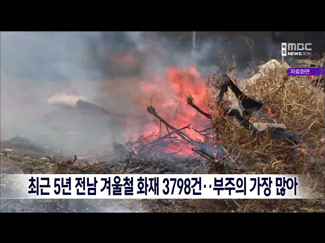 2018년부터 2022년까지 5년간 전남지역 겨울철 화재는 3798건이 발생해409억 7천여만원의 재산피해가 발생했습니다.발생 원인은 쓰레기 소각 등 부주의가 62.6%로 가장 많았고전기적 원인, 기계적 요인 8.2% 순이었습니다.전남소방본부는화재 발생이 잦은 겨울철에 대비해11월부터 4개월 겨울철 화재 예방대책을본격 추진합...