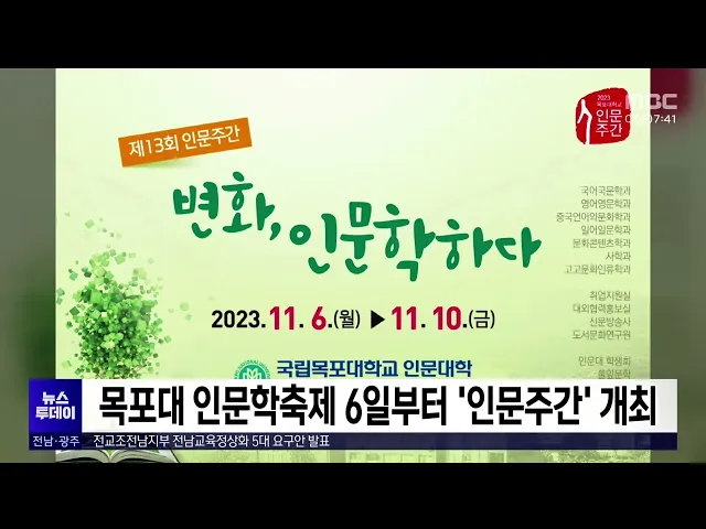 목포대 인문대학은 오는 6일부터 닷새동안도림캠퍼스 인문대학 일원에서 ‘2023 인문주간’ 행사를 개최합니다. 올해로 13회째를 맞는 '인문주간'에서는 ‘변화, 인문학하다’라는 주제로 난장토론과 북콘서트, 섬인문학콘서트, 가을 버스킹, 음식문화 축제 등이 펼쳐지고, 지역주민 초청 행사도 이어질 예정입니다.
