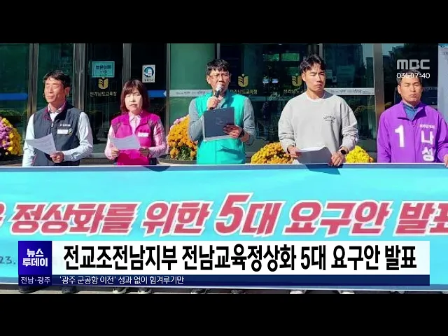 전교조전남지부는 '전남교육 정상화를 위한 5대 요구안’ 발표 기자회견을 하고, 받아들여 질때까지 1인 시위와 함께 앞으로 시민단체와 연대해 '전남교육 멈춤' 등의 행동에 들어가겠다고 밝혔습니다. 전교조전남지부는지난 9월 25일 이전에 발생한 아동학대 피소 교사에 대해 2천5백여 교사들이 탄원서를 제출했지만, 김...