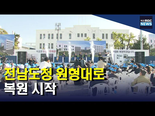 ◀ 앵 커 ▶5.18 민주화운동의 최후 항쟁지였던 옛 전남도청의 복원을 위한 공사가 시작됐습니다.본관과 별관 등 6개 건물이 80년 당시의 모습으로 복원돼, 오월의 가치를 공유하는 열린 공간으로 조성될 예정입니다.조현성 기자가 보도합니다.하나! 둘! 셋!(효과음)두 동강 난 건물들이 하나 둘씩 연결되며 옛 모습을 되찾습...