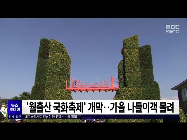 월출산 기찬랜드와영암읍 일대에서 열리는2023 월출산 국화축제가 개막해가을 나들이객들의 발길이 이어졌습니다. '국화, 빛으로 피어나다'를 주제로 한이번 축제에서는 1억 송이 가을 국화로 꾸민 다양한 작품이 전시됐으며 다음 12일까지 공연과 국화 오감체험,백제 의상과 교복 입기 등 20여 종의 프로그램도 다채롭게 ...