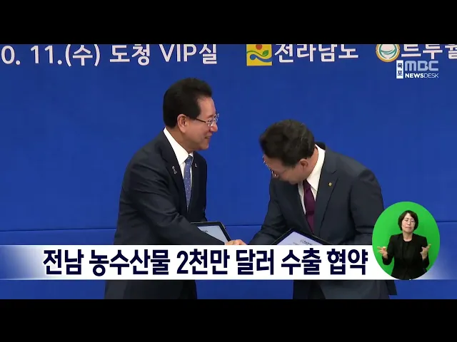 전라남도와 일본 수산물 유통 전문기업트루월드재팬은 지속가능한 수산물 국제인증을 받은 수산물 등 전남산 농수산물의 일본 내 수출 확대를 위한 업무협약을 체결했습니다.이번 협약에 따라 트루월드재팬은 연간 2천만 달러의전남산 농수산물을 수입할 예정이며,전라남도는 현지 맞춤형 제품 개발과 행정 지원을 약속했습...