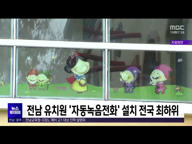 전남지역 유치원 자동녹음전화기 설치 현황이전국 최하위에 머무는 것으로 나타났습니다.도종환 국회의원이교육부로부터 받은 자료에 따르면자동녹음전화기가 설치된 전남 유치원은전체 476곳 가운데 24곳으로전국 17개 시도 가운데 16위를 기록했습니다.또 최근 5년간 시도교육청 교권보호위원회 운영 과정에서전남은유치...