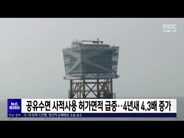 공유수면을 개인이 독점적으로 사용하는 면적이 급증하고 있는 것으로 나타났습니다. 국회 신정훈 의원이 해양수산부로부터 제출받은 자료에 따르면 지난해 공유수면 점·사용허가는 1억 613만㎡미터로 4년전보다 4.3배 증가했지만, 사용료 부과액은 1.2배 증가하는데 그쳤습니다. 공유수면 점사용허가 사유는 해상풍력 등의...