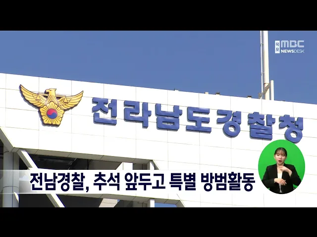 전남경찰청은추석을 앞두고 특별 방범활동에 나섭니다.경찰은특별방범활동 기간 범죄예방진단팀을 중심으로 명절 주요 범죄 발생 장소와취약시설에 대한 범죄예방진단을 실시하고도민 불안감이 큰 지역에 대해서는 기동대 등을 집중 투입해 순찰을 강화할계획입니다.또 명절 기간에는 가정폭력 신고가 집중되는 만큼 재발우...