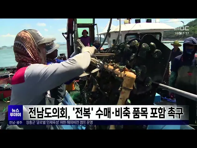 전라남도의회는 수급조절과 가격안정을 위해 전복을 수매와 비축 사업에 포함해야 한다는 내용의 건의안을 채택했습니다.전남도의회는전복 10미 기준 올해 7월 가격은kg당 2만 2천 원으로 지난해보다 전복 평균 가격이 42% 폭락하고판매량이 급감했다며, 전복 가격 안정화를 위한 정부의 지원책 마련을 요구했습니다.