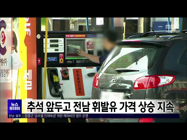추석을 앞두고 전남지역 휘발유 증가세가 이어지고 있습니다. 유가정보사이트 오피넷에 따르면전남지역 휘발유 리터당 평균 가격은 1765 원으로 지난 8월 1일 1619원 보다 한달 사이에 100원 넘게 올랐습니다. 경유 가격도 1664원으로오름세를 지속하고 있습니다.