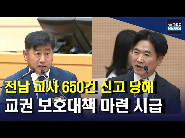 ◀ANC▶ 전남지역 교사들이 지난 5년 동안 학생과 학부모 등으로부터 650건의 신고를 당한 것으로 조사됐습니다. 전남도의회는 교권 보호대책 마련을 요구했습니다. 전남도의회 도정,교육행정 질의 마지막날 나온 내용을 박종호 기자가 정리했습니다. ◀END▶ ◀VCR▶ 전남지역 교사들도 신고와 고소·고발로 인한 법적 ...