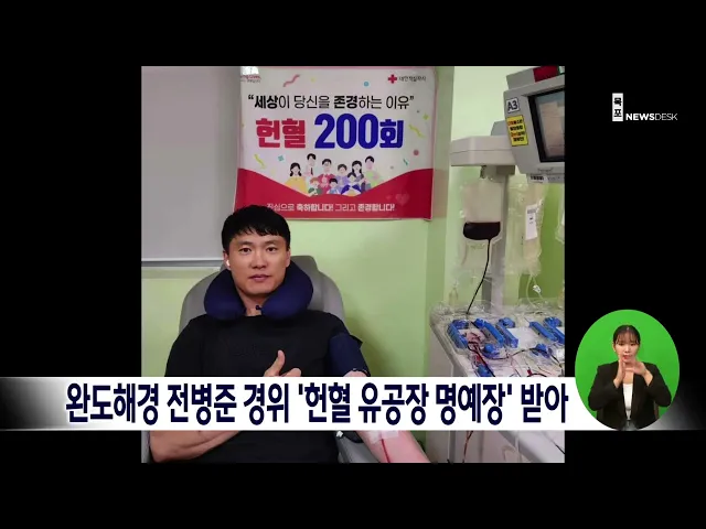 완도해양경찰서 소속 전병준 경위가 헌혈 유공장 ‘명예대장’을 받았습니다. 전병준 경위는 1993년 고교 시절부터 청소년적십자 활동을 통해 헌혈을 시작해 지금까지 사랑의 헌혈을 실천하고 있으며, 그동안 혈소판 헌혈 등 200회에 거쳐 헌혈을 이어오고 있습니다.