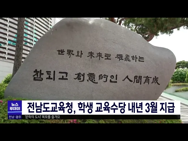전남 학생교육수당이 내년 3월부터 지급됩니다. 전남교육청은 내년 3월부터 시 지역은 학생 1인당 월 5만원씩, 군 지역은 월 10만원씩 교육수당을 지급하기로 하고, 지급대상 8만7천명에 필요한 예산 5백60억원을 반영하기로 했습니다. 김대중 교육감의 핵심 공약인 '학생교육수당'은 당초 올 하반기 지급될 예정이었지만, ...