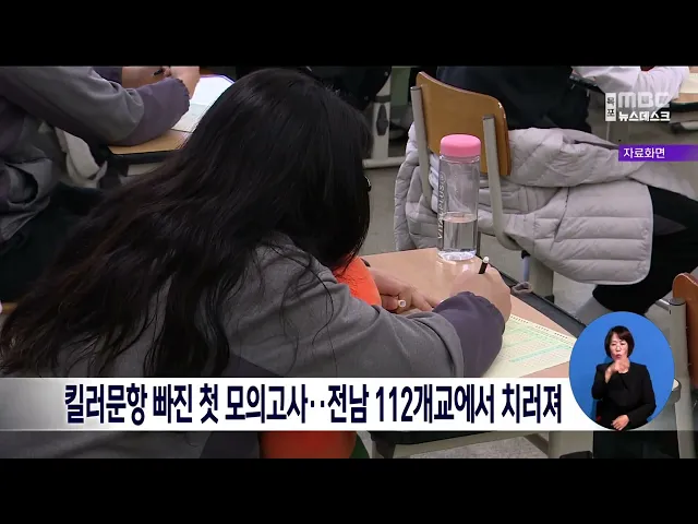 이른바 '킬러문항' 논란 후 첫 모의고사인 9월 모의평가가 전남에서도 112개 고교에서 치러졌습니다. 전남지역 응시 인원은 고3 수험생 11,617명과 재수생 403명 등 모두 12,020명으로 성적은 다음달 5일 통지됩니다 이른바 킬러문항이 빠진 첫 모의평가는 국어는 어려운 반면 수학은 쉬웠다는 평가가 나오고 있습니다.
