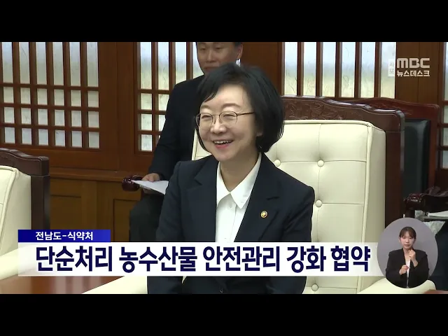 전라남도와 식품의약품안전처가국민의 안전한 먹거리 확보를 위한 단순처리 농수산물 안전관리 강화 업무협약을 체결했습니다.협약식에는 오유경 식품의약품안전처장과 강위원 전남도 경제부지사 등이 참석했으며, 가공품이 아니라 위생 관리가제한적일 수 밖에 없는 마른김, 절임배추 등 농수산물의 자율점검 시범사업 추...