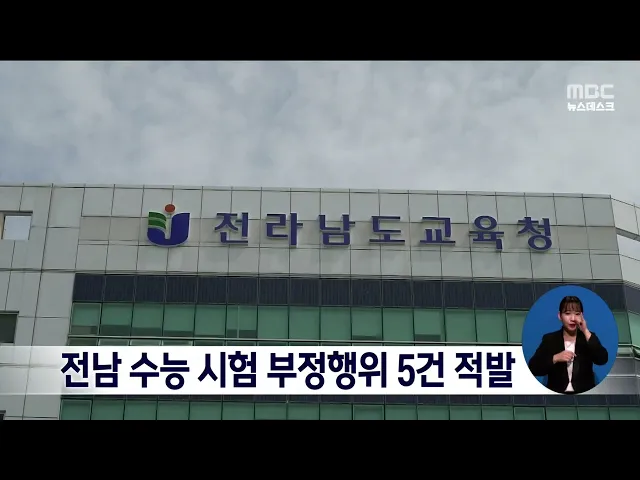 2023학년도 대학수학능력시험에 전남에서는 5건의 부정행위가 적발됐습니다. 전라남도교육청은 가방 속에 블루투스 이어폰을 가지고 있던 수험생 1명을 퇴실 조치했고 4교시 선택과목 시험에서 시험지를 한꺼번에 책상에 올려놓거나 순서를 바꾸는 등 시험 미숙지로 인한 부정행위 4건을 적발했습니다.