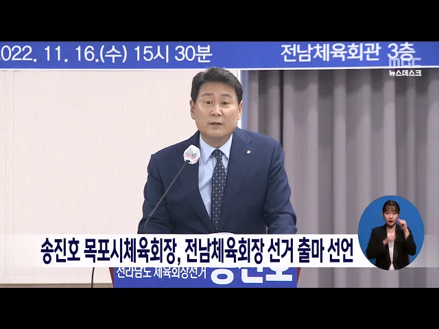 송진호 목포시체육회장이 다음 달 15일 치러지는 전남체육회장 선거에 출사표를 던졌습니다. 송진호 목포시체육회장은 출마회견을 열고 안정적 체육예산 확보를 위한 체육진흥조례 개정, 전문체육*생활체육 활성화, 104회 전국체전 성공 개최 등을 공약을 제시했습니다. 전남체육회장 선거는 송진호 목포시체육회장을 비롯...
