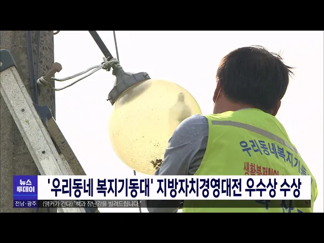 전라남도의 '우리동네 복지기동대'가 대한민국 지방자치경영대전 사회복지서비스 부분에서 우수상을 수상했습니다. '우리동네 복지기동대'는 마을 이,통장과 설비 전문가 등이 주민들의 생활 불편을 해소해주는 복지 제도로 22개 시군 297개 읍면에 모두 설치돼 지난 4년 동안 6만 4천여 가구가 다양한 지원을 받았습니다....