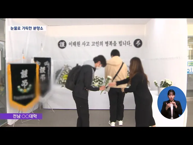 ◀ANC▶ 이태원 참사로 숨진 희생자에 대한 추모행렬이 전남에서도 이어지고 있습니다. 간호사를 준비하던 늦깎이 대학생의 분향소가 마련된 학교 전체는 슬픔에 잠겼습니다. 박종호 기자가 취재했습니다. ◀END▶ ◀VCR▶ 이태원 참사로 숨진 대학생 2명이 다녔던 전남의 한 대학에 분향소가 마련됐습니다. 학생들은 국...