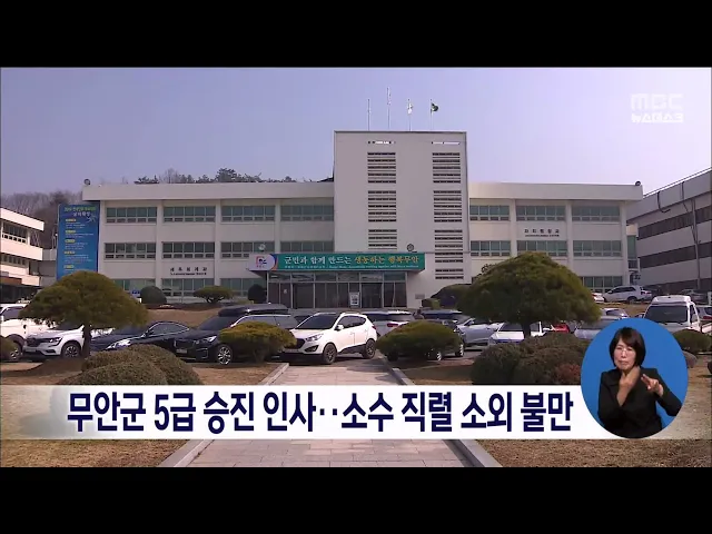 무안군이 소수 직렬에 대한 안배가 부족하다는 지적이 나오고 있습니다. 무안군은 오늘(25) 5급 사무관 승진 대상자를 발표했는데 당초 예상했던 수산과 지적 등 소수직렬은 승진 인사에서 배제됐습니다. 군청 내부에서는 전문 소수직렬이 승진 인사에서 밀려난 불만과 근무평정에 대한 공정성 시비가 제기되는 등 주요 직...