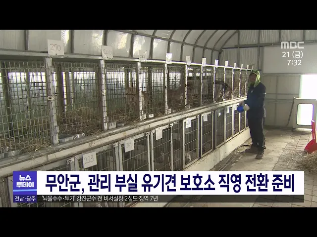 무안군이 유기견보호소 직영 운영 체제 전환을 준비하고 있습니다. 무안군은 매년 5천여만원을 지원하며 유기견보호소를 개인에게 위탁해 운영하고 있지만 최근 관리 운영의 문제점이 드러남에 따라 내년부터는 무안군이 직접 운영하기 위한 방안을 마련하고 있다고 밝혔습니다.