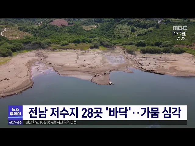 올해 심각한 가뭄이 이어지면서 전남 28개 저수지가 바닥을 드러낸 것으로 나타났습니다. 한국 농어촌공사의 국정감사 자료에 따르면 지난 달 20일 현재 저수율이 부족한 전국 45개 저수지 가운데 전남이 62%가 넘는 28곳으로 가장 많았습니다. 이 가운데 가뭄 위기관리 단계상 심각 단계인 곳이 14곳으로 절반을 차지했습...