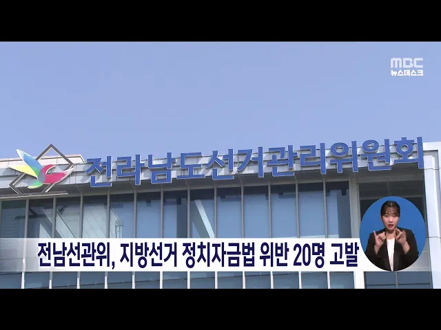 전남선거관리위원회는 전국 동시지방선거 선거비용과 관련해 정치자금법 위반혐의가 있는 후보자와 회계책임자 20명을 검찰에 고발했습니다. 후보자와 회계책임자 등 11명은 공고된 선거비용제한액을 최대 52%까지 초과 지출했으며, 후보자 6명은 선거사무관계자에 대한 법정 수당 이외의 추가적 금전 보상, 3명은 미신고된...
