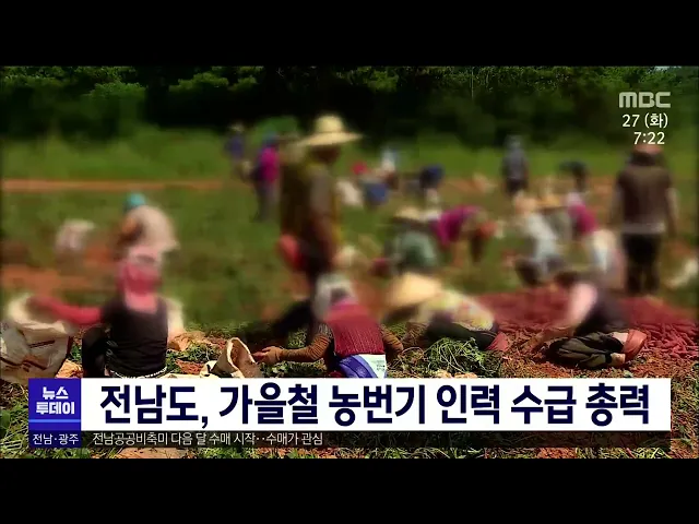 전라남도가 가을철 영농기를 맞아 인력 수급을 위해 다양한 대책을 마련했습니다. 전라남도는 농촌 인력공급의 중심축에 있는 도내 35개소 농촌인력중개센터 주요 농작업반을 3천500명으로 확대해 인력중개 데이터베이스를 구축하고 시군 간 농작업반을 교류 투입해 중개 범위를 확대했습니다. 또 3~5개월간 외국인을 고용...