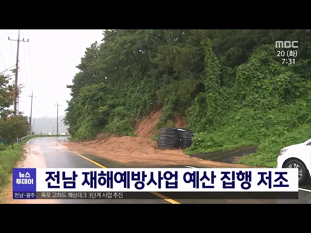 전남의 재해예방사업 예산 집행률이 전국 평균 이하인 것으로 나타났습니다. 행정안전부가 국회에 제출한 자료를 보면 올해 8월 말 기준으로 전남의 풍수해생활권 종합정비사업 예산집행률은 38%, 자연재해위험개선지구 42%, 재해위험저수지 42.5%, 조기경보시스템 34.8% 등 전국 평균 65%와 큰 차이를 보였습니다. 국민의...