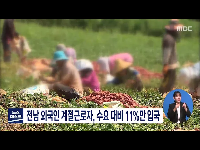 최근 5년동안 전남지역 농어촌 부족한 일손을 도울 외국인 계절근로자 입국자 수가 실수요 대비 11% 수준에 불과한 것으로 나타났습니다. 국민의힘 노용호 국회의원에 따르면 2017년부터 올해 7월까지 전라남도가 법무부에 신청한 외국인 계절근로자는 5107명이었지만 입국자는 580명으로 지자체가 필요하다고 본 외국인 계...