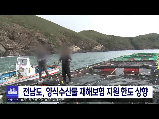전라남도가 자연재해 피해를 입은 양식어가의 신속한 피해복구와 경영 안정을 위해 양식수산물 재해보험 지원한도를 천만원으로 올리기로 했습니다. 그동안 어입인은 보험료의 10%를 자부담하고, 나머지는 국비 50%, 지방비 40%를 지원받았지만 지방비 지원한도액이 500만 원으로 지원 실효성이 떨어진다는 지적이 제기됐었...