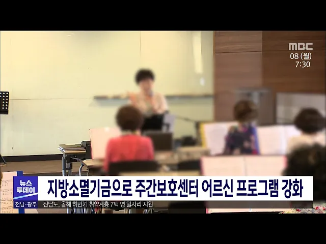 전라남도는 지방소멸기금 사업으로 노인주간보호센터를 이용하는 장기요양 어르신들을 위한 프로그램을 지원하겠다고 밝혔습니다. 도내 노인주간보호센터는 260곳으로 어르신 6천 3백여 명이 이용하고 있으며 센터마다 최대 5백만 원에 이르는 이번 지원을 통해 외부 전문강사를 활용한 인지재활, 신체활동 프로그램 등을 ...