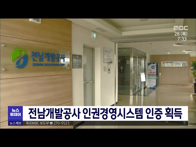 전남개발공사가 한국경영인증원으로부터 인권경영시스템 인증서를 받았습니다. 전남개발공사는 지난 2천18년 지방공기업으로는 유일하게 인권경영 매뉴얼 시범사업에 참여해 조직 내 인권 성숙도 향상과 다양한 인권경영 문화를 조성해 왔습니다.