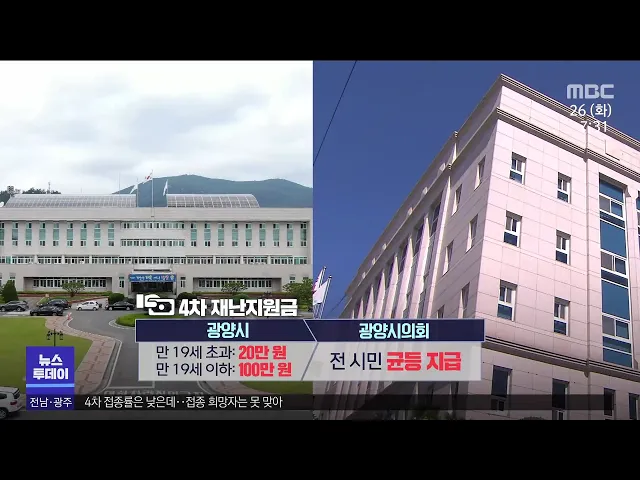 ◀ANC▶ 광양시의 4차 재난지원금에 대한 예산 심사가 오늘(26)부터 시작되지만, 지급 방식을 두고 집행부와 시의회가 합의점을 찾지 못하고 있습니다. 예산 승인권을 쥐고 있는 시의회는 차등 지급을 수용할 수 없다는 입장인데, 광양시가 절충안을 제시할 거란 관측이 나오고 있습니다. 문형철 기자입니다. ◀VCR▶ [C/...