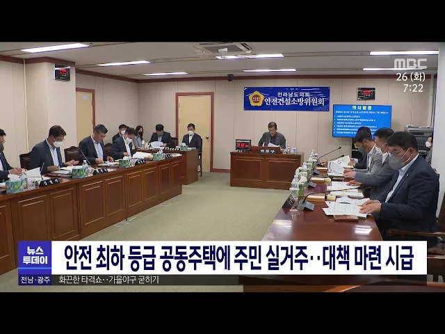 전남지역 공동주택 가운데 6개 동이 시설물 안전등급에서 최하등급인 'E'를 진단받고도 행정기관의 무관심 속에 다수의 주민들이 실거주하고 있는 것으로 나타났습니다. 전남도의회 박문옥 의원은 "E등급은 즉각 사용을 중지하고 보강이나 개축해야하는 위험한 상태임에도 불구하고 전남도와 지자체는 어떤 행정절차도 진...