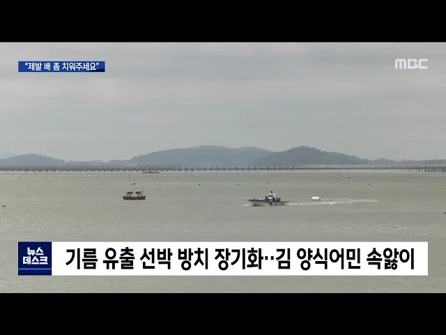◀ANC▶ 최근 황금어장에 기름을 유출시킨 낡은 선박 처리문제를 놓고 어민들의 우려가 깊어지고 있습니다. 무안군이 김 양식철까지 선박을 치울 수 있을까 하는 행정불신 때문입니다. 양현승 기자가 취재했습니다. ◀END▶ ◀VCR▶ 무안군 도리포 해상입니다. 지난 11일 기름 유출사고가 났던 노후선박이 여전히 잠자...