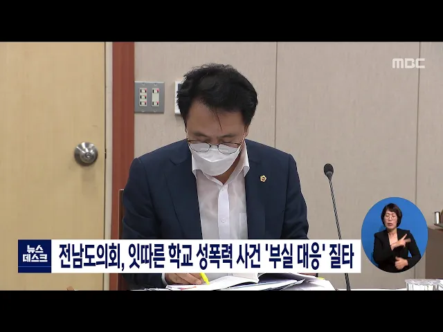 최근 전남지역 교직원들의 성폭력 사건이 잇따른 것과 관련해 전남도의회가 전남교육청의 부실한 대응을 질타했습니다. 전남도의회 송형곤 의원은 최근 발생한 성폭력 사건과 관련해 교육당국의 부실한 대응과 사건 은폐 시도로 2,3차 피해가 발생하고 있다고 지적하고 도교육청 내 전담조사관을 배치하는 등 대응체계를 ...