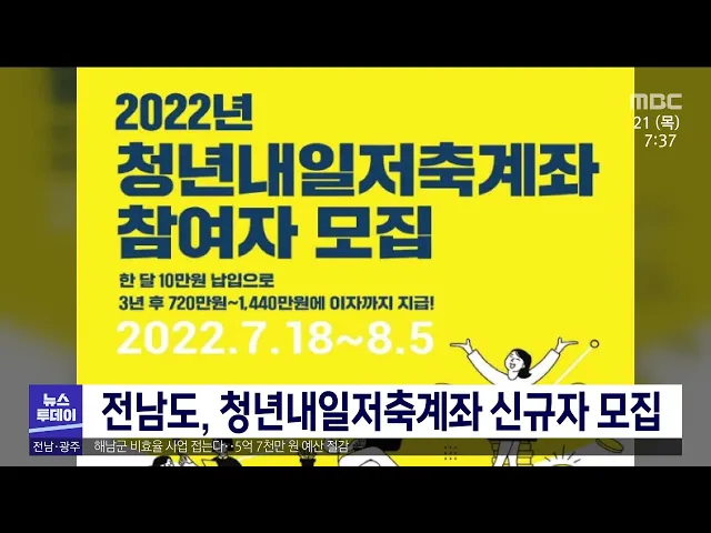 전라남도가 저소득 청년의 경제적 자립을 지원하기 위해 청년내일저축계좌 신규자 모집을 8월 5일까지 진행합니다. 청년내일저축계좌는 청년이 3년간 매달 10만 원씩 저축하면 정부가 10만원에서 30만원까지 일정금액을 매칭, 지원하게 됩니다. 가입을 위해서는 가구소득, 연령, 근로기준, 가구재산 등 4가지 기준을 충족해...