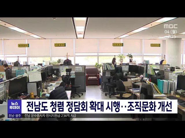 전라남도 감사관실이 조직 내 불공정한 관행과 청렴도 향상을 위해 실시한 청렴 정담회를 확대해 시행합니다. 감사관실은 지난 4월부터 7급 이하 MZ세대와 정담회를 갖은 데 이어 이달부터는 5.6급 중간 직급과 공무직, 청원경찰과도 청렴 정담회를 개최한다고 밝혔습니다. 청렴 정담회를 통해 수렴한 제안들은 조직 문화 ...