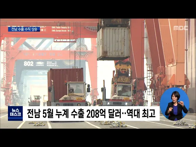 ◀ANC▶ 코로나 사태와 고유가의 악재 속에서도 올해 전남 수출이 역대 최고 실적을 갈아치웠습니다. 공산품부터 농수축산물에 이르는 전 품목에서 기록적인 신장세를 보였습니다. 문연철 기자가 보도합니다. ◀VCR▶ 올들어 5월까지 전남지역 수출액은 2백8억 달러, 지난해 같은 기간보다 33% 증가했으며 5월 누계 기준...