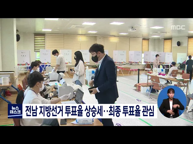 제8회 지방선거에서 전남지역 최종 투표율에도 관심이 쏠리고 있습니다. 앞서 실시된 사전투표에서 31.04%의 투표율을 기록해 전남이 전국에서 유일하게 30%대 투표율을 보인 가운데 6회 지방선거 65.6%, 7회 지방선거 69.2% 등 전남의 최종 투표율 상승세가 이어질 지도 관심이 모아지고 있습니다.