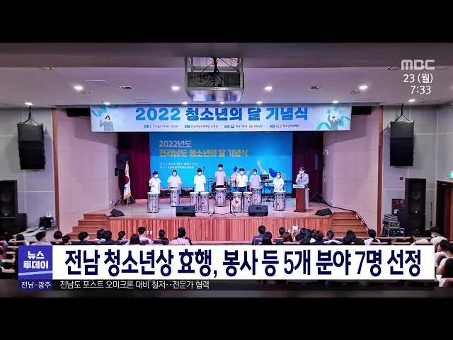 5월 청소년의 달을 맞아 열린 '전남도 청소년상' 시상식에서 7명이 수상했습니다. 전남도 청소년 대상은 구례고 3학년 선민지 학생이 수상했고, 효행, 봉사 면학, 예체능, 국제화 등 5개 분야 6명이 표창을 받았습니다. 한편, 지난 21일 전남여성가족재단에서 열린 청소년의 달 기념행사에서는 청소년과 지도자 등 2백여명...