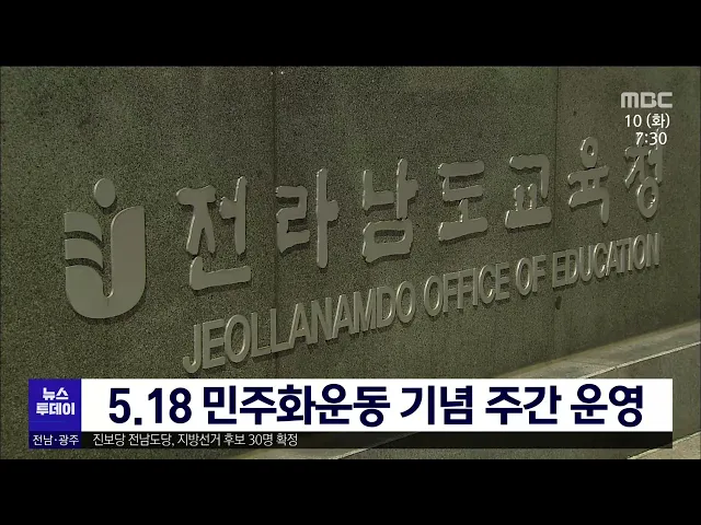 전라남도교육청이 제 42주년 5.18 민주화 운동을 앞두고 오는 20일까지 기념 주간을 운영합니다. 전남교육청은 수업 자료와 책자 등을 희망학교에 배부해 수업에 활용할 수 있게 했으며, 청소년 미술 공모전과 오월도서읽기 등 프로그램을 추진할 계획입니다.